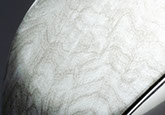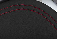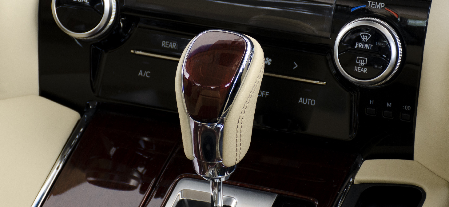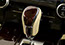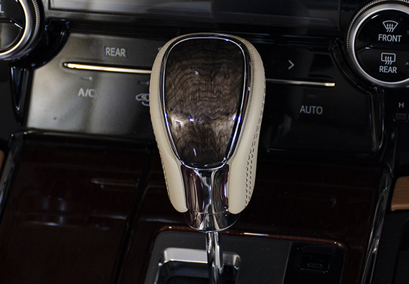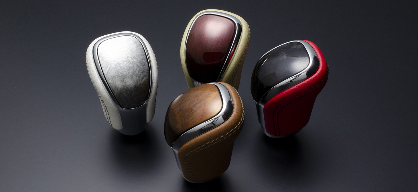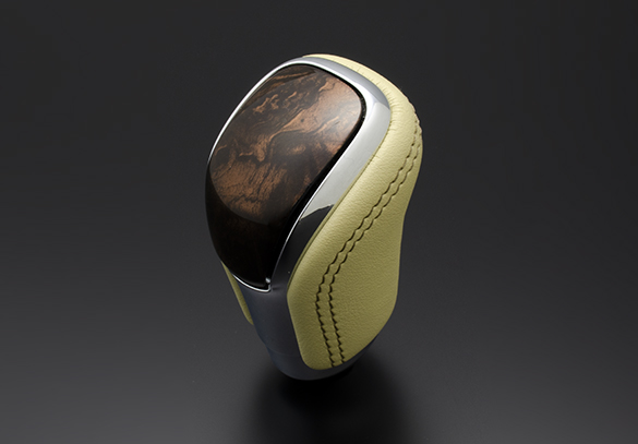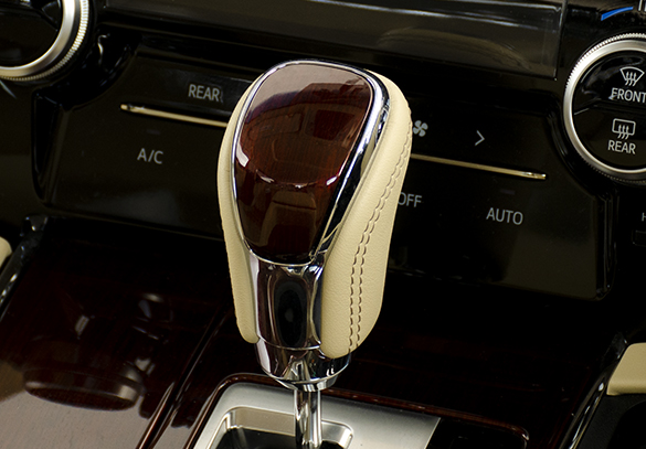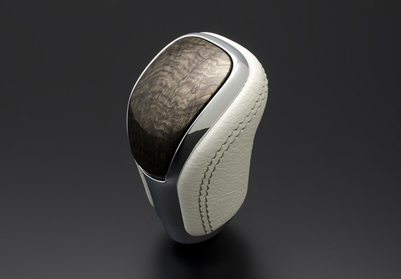 純正シフトノブに合皮レザーを貼り込み、サイド部分から後ろに回り込むようにダブルステッチを施しております。純正部品はゴム素材をレザーのように見せている だけですが、実際に貼りこまれたPVCレザーの見た目と感触は純正とは全く異なった