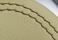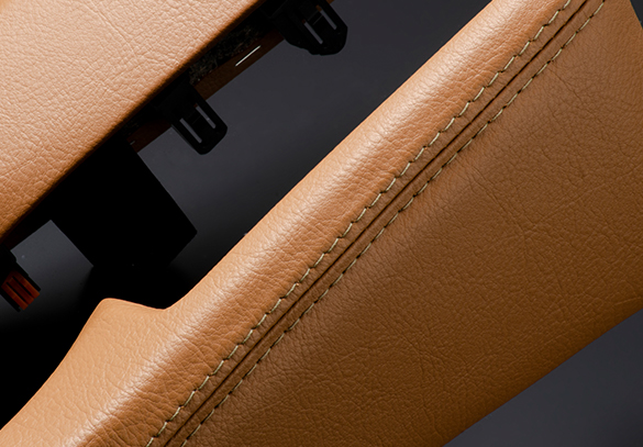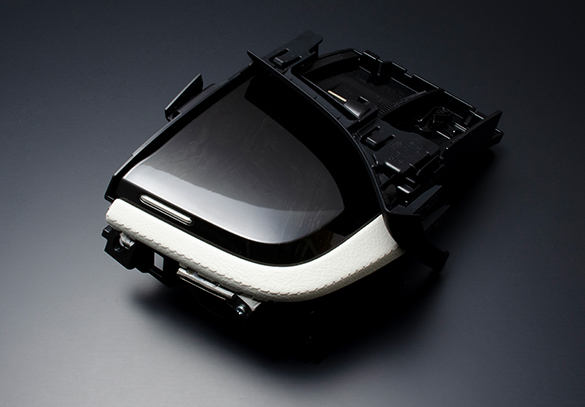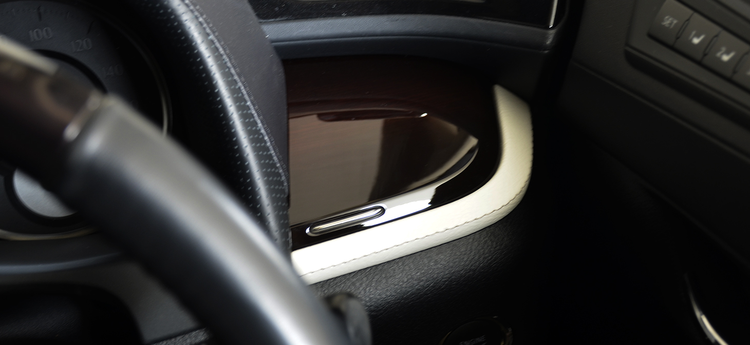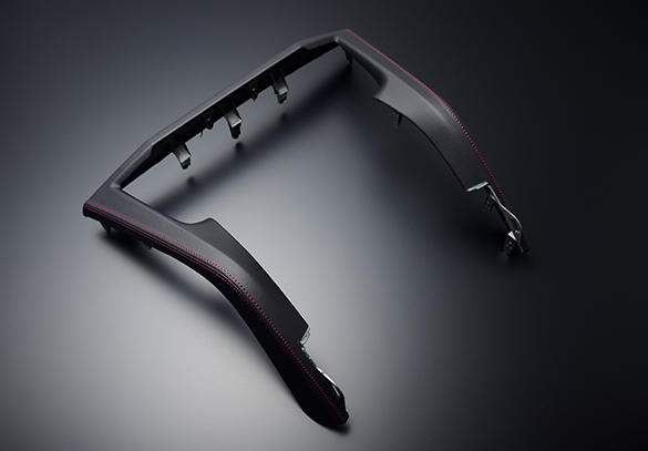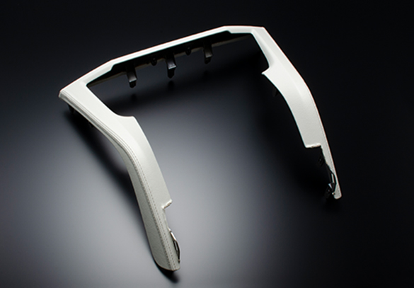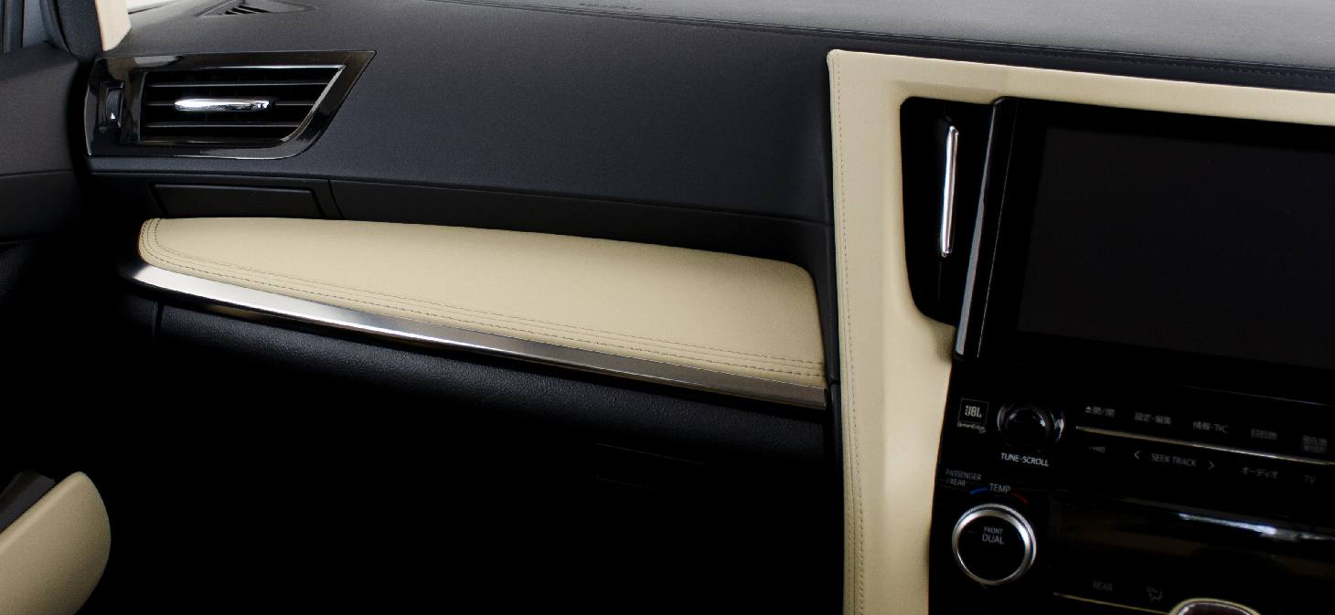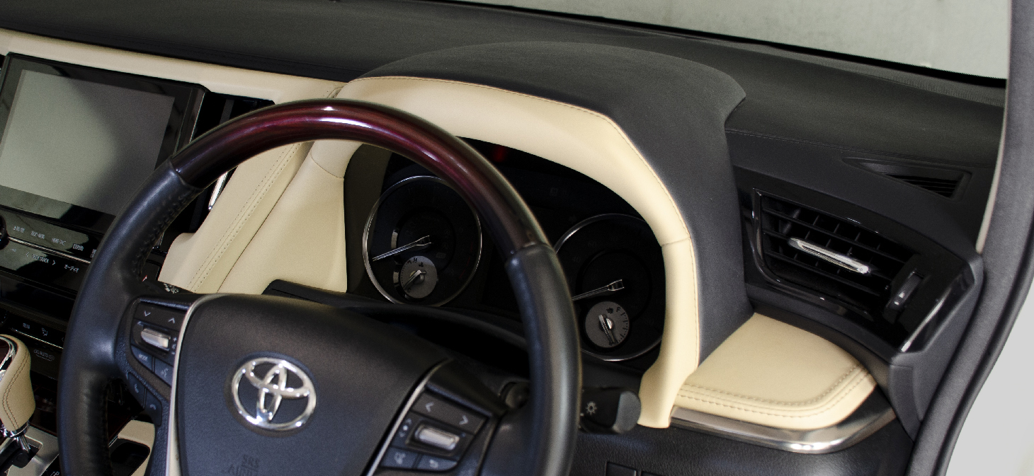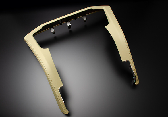 助手席側パネルガーニッシュの天面部分にPVCレザーを貼込み、さらにダブルステッチを施した商品です。純正オーナメントはあえて消し、内装色への統一を計った製品です。