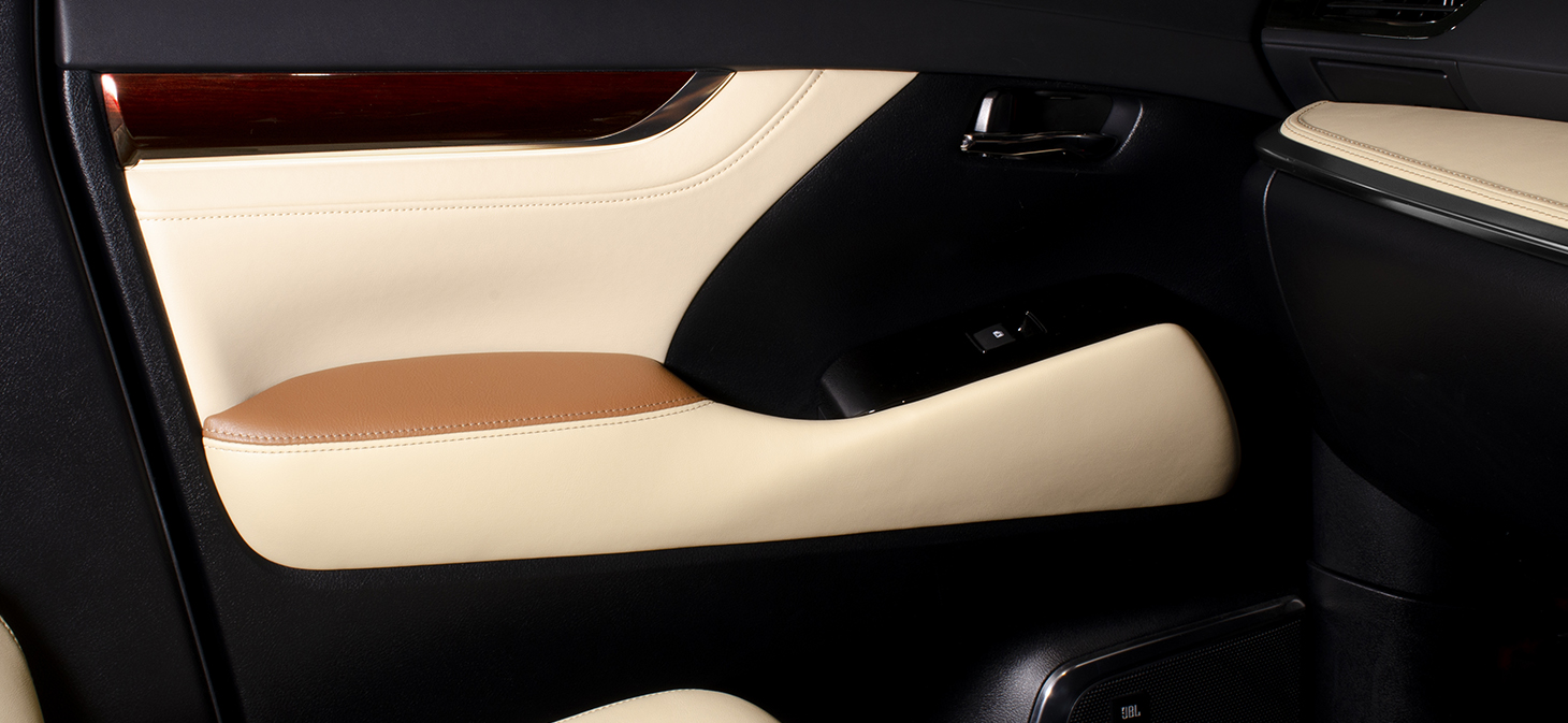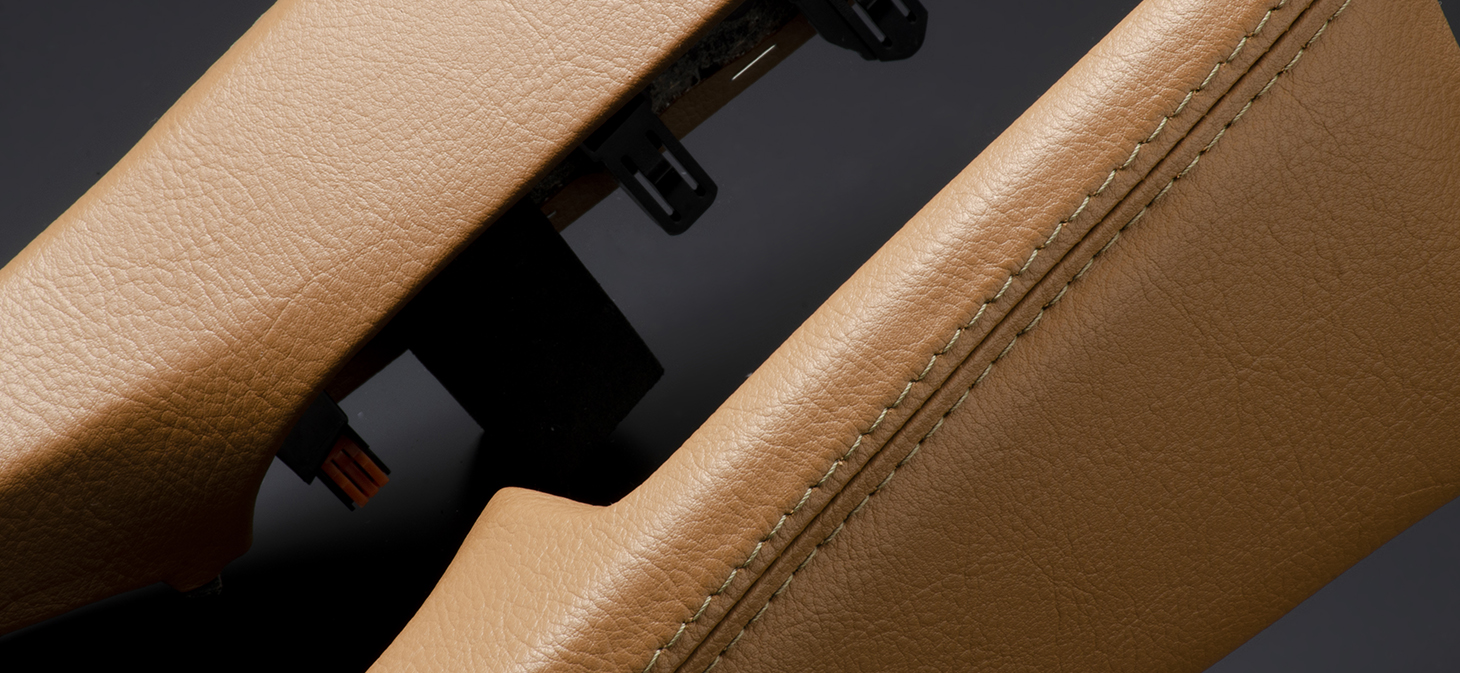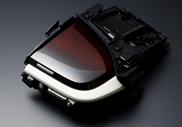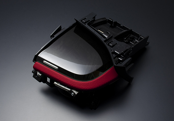 大型コンソールのサイド部分を彩るコンソールサイドガーニッシュの純正表皮を剥がして、合皮レザーを貼り込み純正同様にステッチを施しております。純正では飽き足らない拘りのオーナー様へ向けてのパーツとなります。