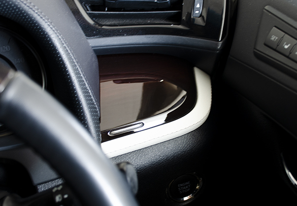 運転席カップホルダーのスライドカバー部分にPVCレザーを貼込み、さらにダブルステッチを施した商品です。純正オーナメントはあえて消し、内装色への統一を計った製品です。