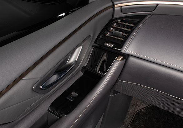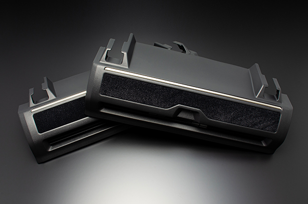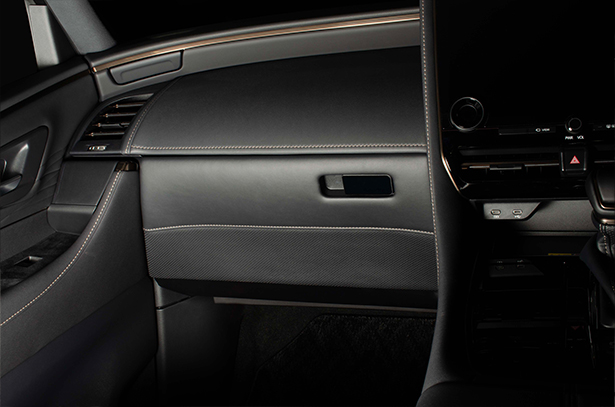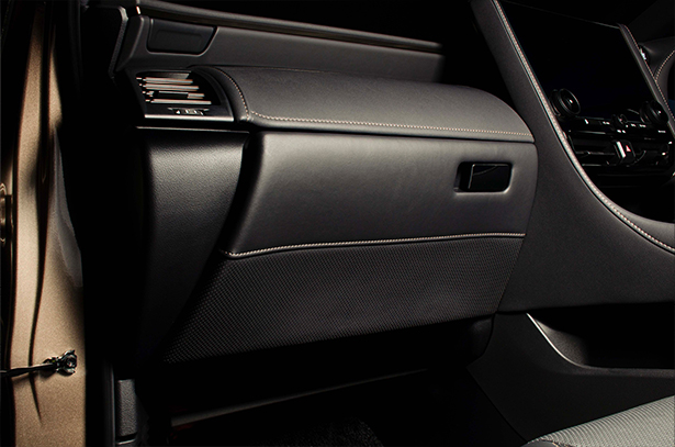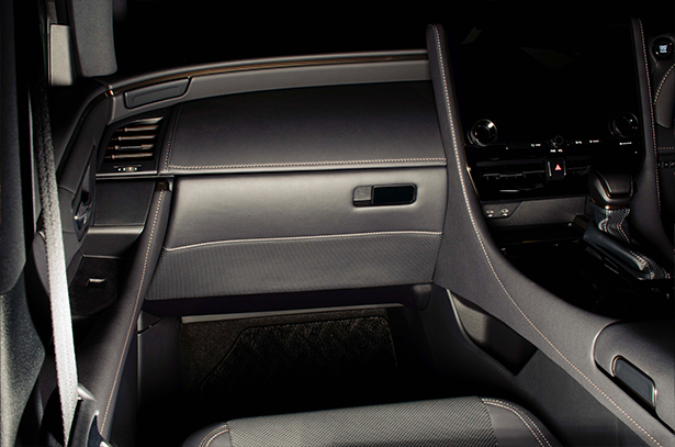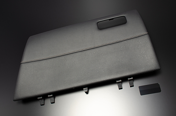 純正グローブボックスの加工品です。製品下部には純正シートと同じ様なスポーティなパンチング素材をあしらい、製品上部にはレザーを貼り込んでいます。また、その境には純正近似色のステッチをあしらいました。その仕上がりは上質で高級感のあるインテリアを実現します。