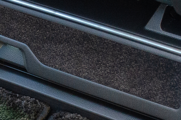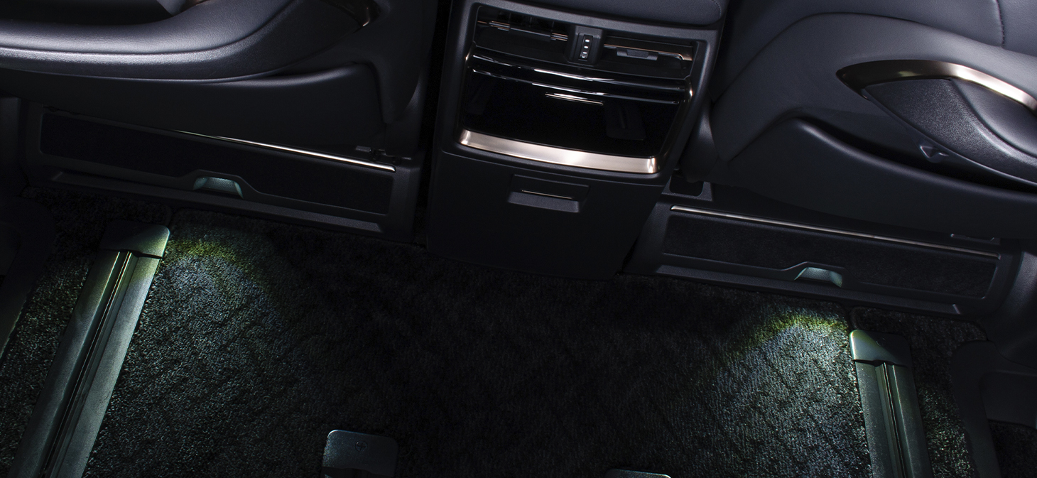 こちらの商品は "フットランプ イルミネーション" 付きのフットレストとなります。純正では、引き出し付きのトレーが付いたフロントシート アンダーカバーですが、樹脂製でチープなデザインをしています。それに比べ、この商品はメッキモール付きのフットレストにする事で高級感あふれる物とし、フロントと連動したフットランプが、夜の室内空間もより一層高めることが出来ます。さらに、フットレスト部分もカーペット生地となっていますので、より上質な空間へと演出します。