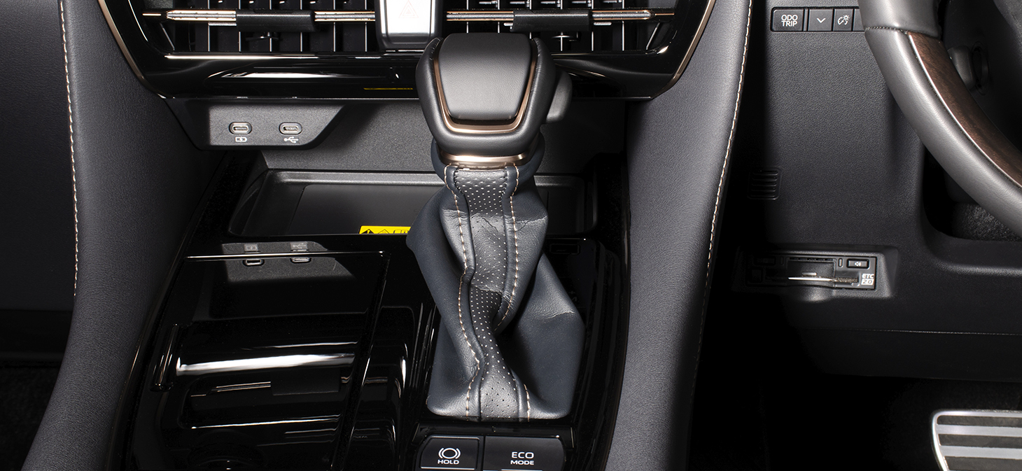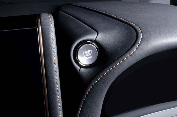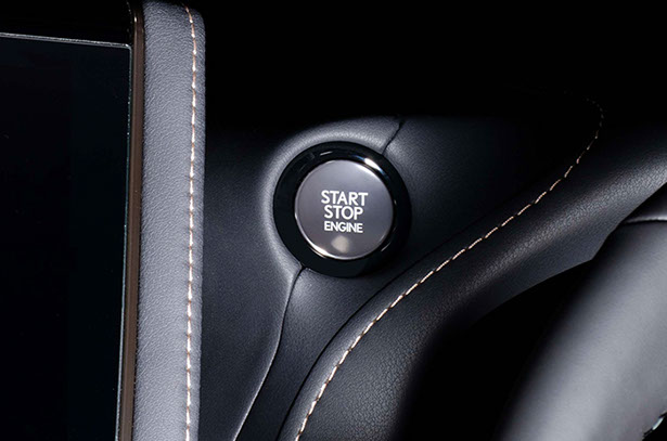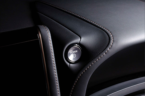 LEXUS 意匠のGASOLINE 用スタートボタンです。トヨタとは異なった光輝シルバーのボタンは逆アールのかかったデザインで、触り心地も流石レクサスといった感触です。外周のリングもトヨタとは異なり、丸みを帯びたスムーズなイメージとなります。ガソリン意匠ですが、ハイブリッド車にも使用出来ます。