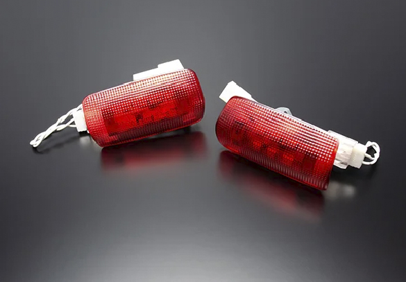 北米仕様な雰囲気を愉しめる事で人気の赤い照明を放つカーテシランプのユニットを、まるでハイマウントストップランプかの如く強烈な照射光でファッション性を組み入れた遊びココロのカーテシランプがお愉しみ頂けます。消灯時のレンズも赤色とするため、レッドレンズを専用で用意。そこに内蔵する6ヶ所点灯のLED基盤は、よもやカーテシランプとしては必要以上の明るさを放ち鮮明に照らし上げる光量をお届け致します。