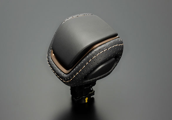 純正シフトノブの加工品です。シフトノブサイド部には純正シートと同じ様なスポーティなパンチング素材をあしらい、製品上部にはレザーを貼り込んでいます。また、その境には純正近似色のステッチをあしらいました。その仕上がりは上質で高級感のあるインテリアを実現します。