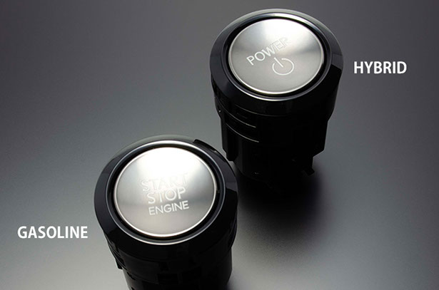 LEXUS 意匠のHYBRID 用スタートボタンです。トヨタとは異なった光輝シルバーのボタンは逆アールのかかったデザインで、触り心地も流石レクサスといった感触です。外周のリングもトヨタとは異なり、丸みを帯びたスムーズなイメージとなります。ハイブリッド意匠ですが、ガソリン車にも使用出来ます。